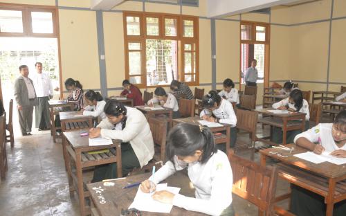 ထို့နောက် ပြည်ထောင်စု၀န်ကြီးနှင့် တာ၀န်ရှိသူများသည် အမှတ်(၁)အခြေခံပညာအထက်တန်းကျောင်းနှင့် အမှတ်(၂)အခြေခံပညာ အထက်တန်းကျောင်းများတွင် ကျောင်းသား ကျောင်းသူများ နှစ်ဆုံးစာမေးပွဲ ဖြေဆိုနေမှုများကို လှည့်လည်ကြည့်ရှု အားပေးသည်။