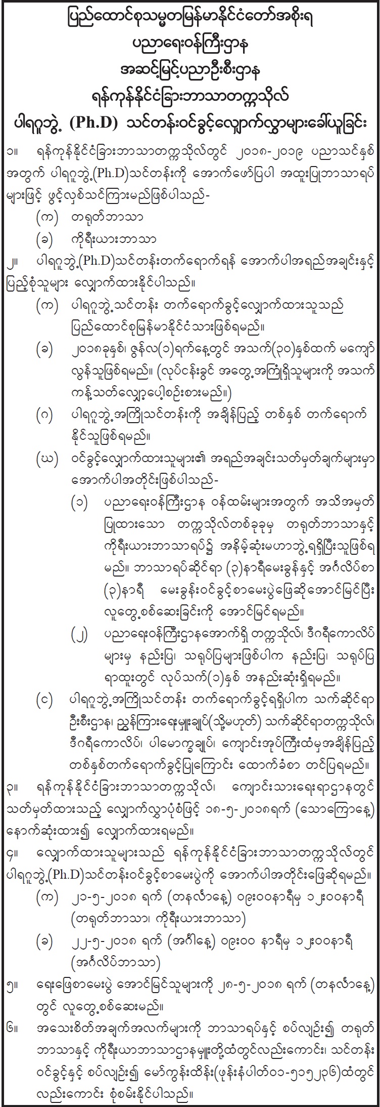 ရန်ကုန်နိုင်ငံခြားဘာသာတက္ကသိုလ် ပါရဂူဘွဲ့သင်တန်း ဝင်ခွင့်လျှောက်လွှာများ ခေါ်ယူခြင်း