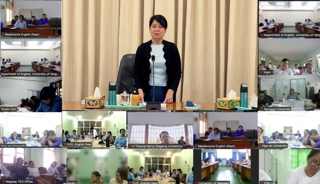 Union Minister for Education, Dr. Chaw Chaw Sein, Deputy Minister, Dr. Zaw Myint, Directors-General, Rectors, Deputy Directors-General, Pro-Rectors, Directors and officials, and English teachers from the Department of Higher Education, the Department of Teacher Education, and the Department of Basic Education attended online.