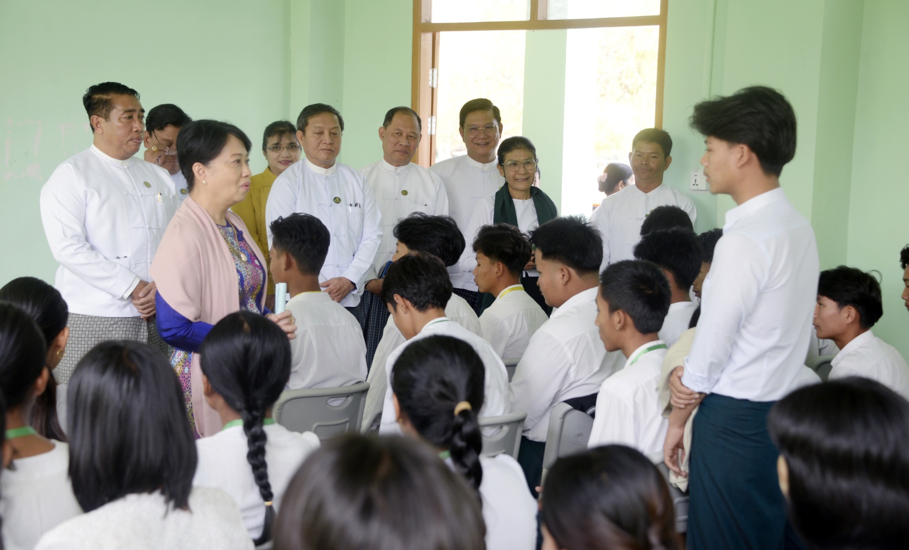 The Union Minister for Education, Dr. Chaw Chaw Sein, together with the Deputy Minister U Nay Myo Hlaing, Directors General, and responsible officials, visited the Basic Education and Industrial, Agricultural, and Livestock High School (MRTV) in Thawta Village, Tatkon Township, Ottarathiri District, Nay Pyi Taw Union Territory, this morning. They inspected students’ learning activities and delivered words of encouragement.