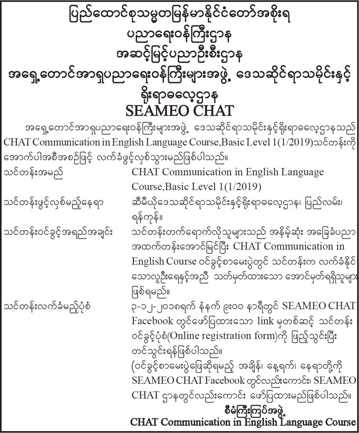 အရှေ့တောင်အာရှပညာရေးဝန်ကြီးများအဖွဲ့ ဒေသဆိုင်ရာသမိုင်းနှင့် ရိုးရာဓလေ့ဌာန SEAMEO CHAT သင်တန်းသားခေါ်ယူခြင်း