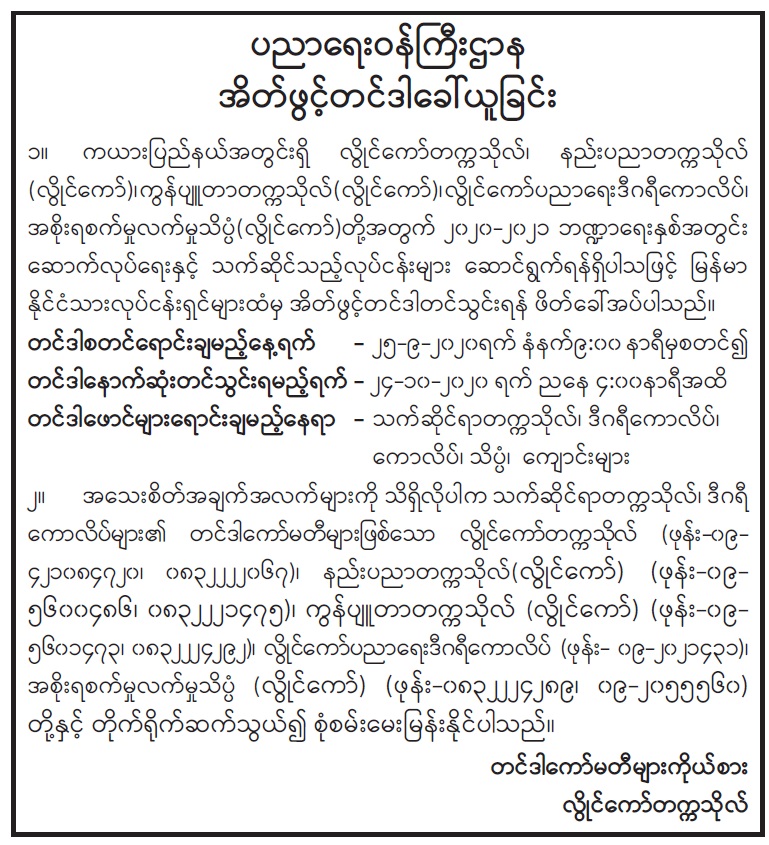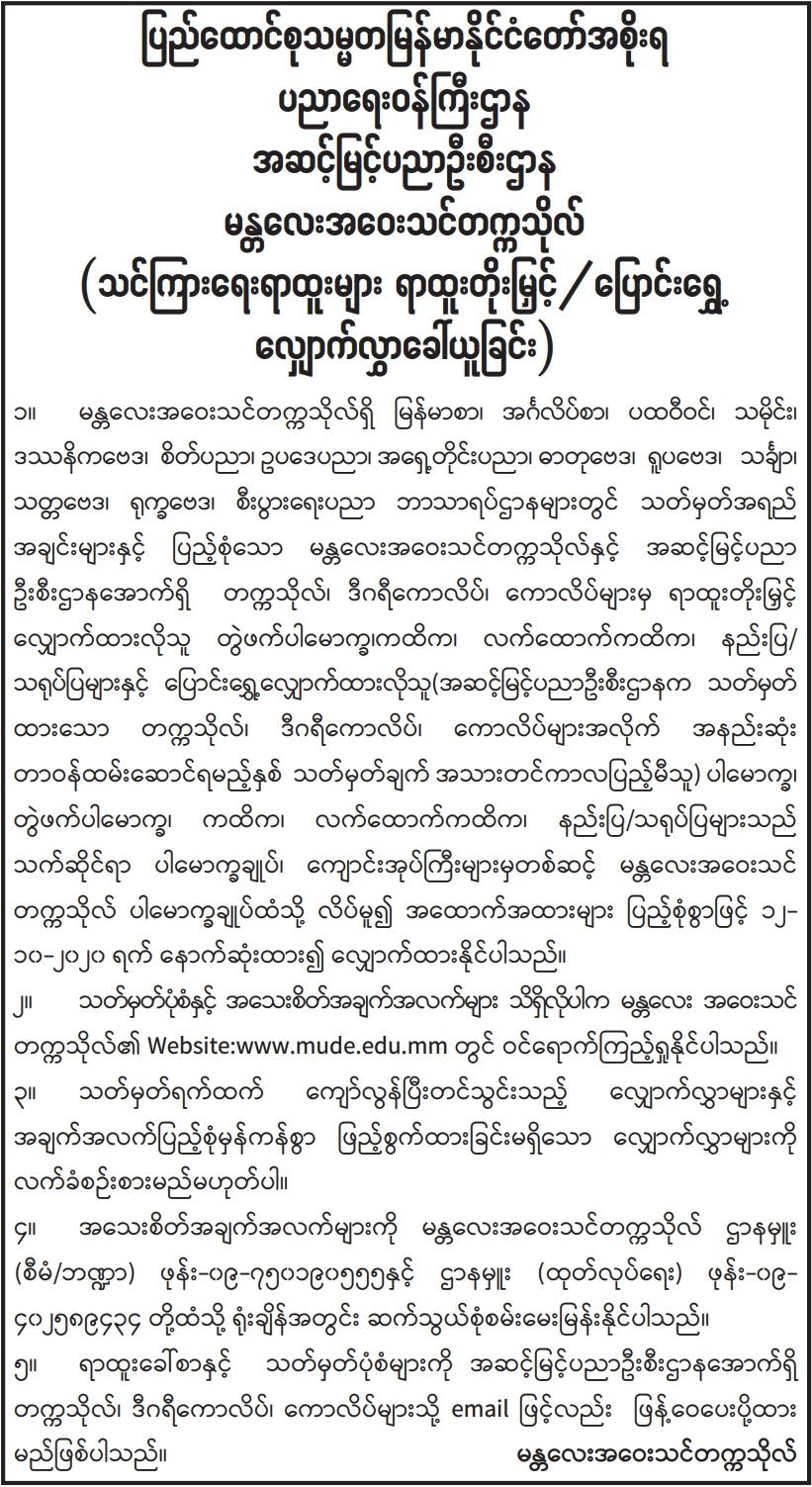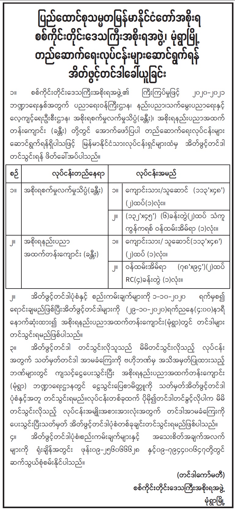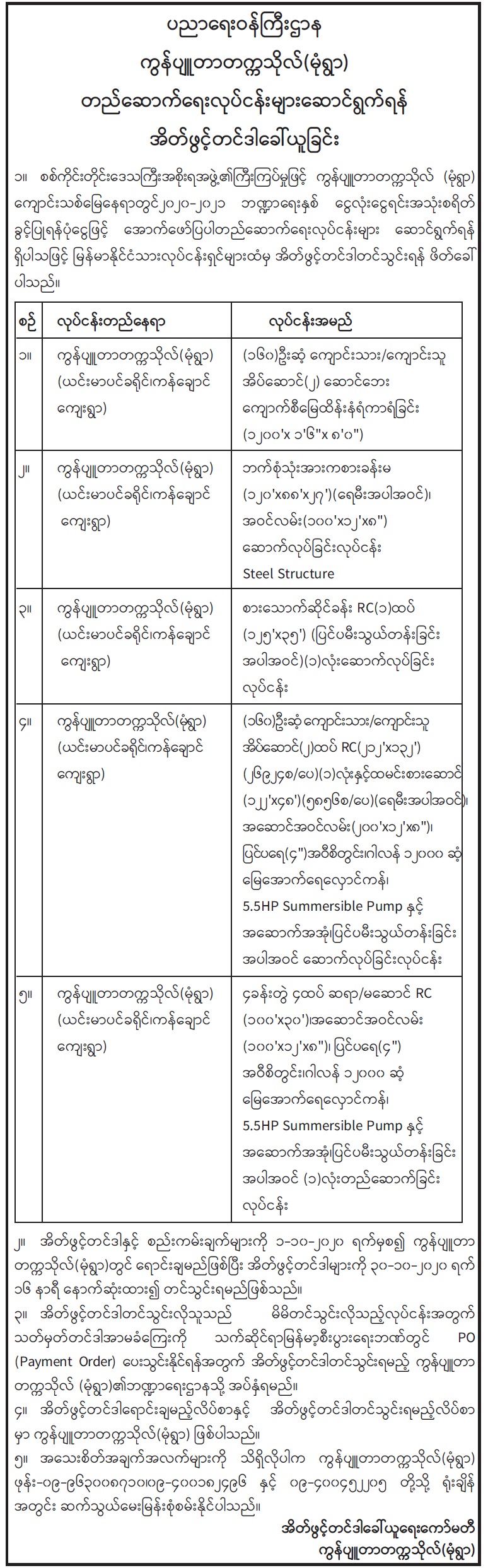 မုံရွာတက္ကသိုလ် တည်ဆောက်ရေးလုပ်ငန်းများဆောင်ရွက်ရန် အိတ်ဖွင့်တင်ဒါခေါ်ယူခြင်း Type: တင်ဒါကြေညာချက်များ