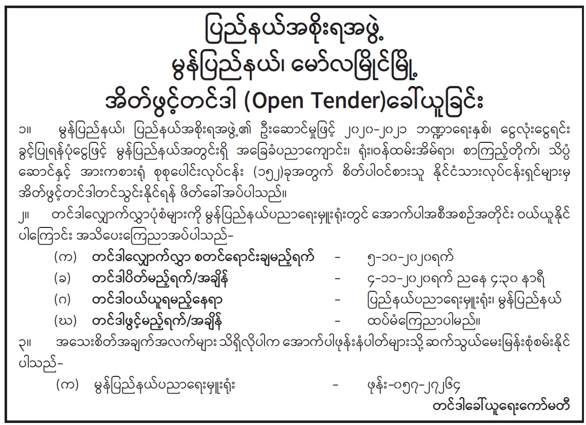 ပြည်နယ်အစိုးရအဖွဲ့ မွန်ပြည်နယ်၊ မော်လမြိုင်မြို့ ၊ အိတ်ဖွင့်တင်ဒါခေါ်ယူခြင်း Type: တင်ဒါကြေညာချက်များ
