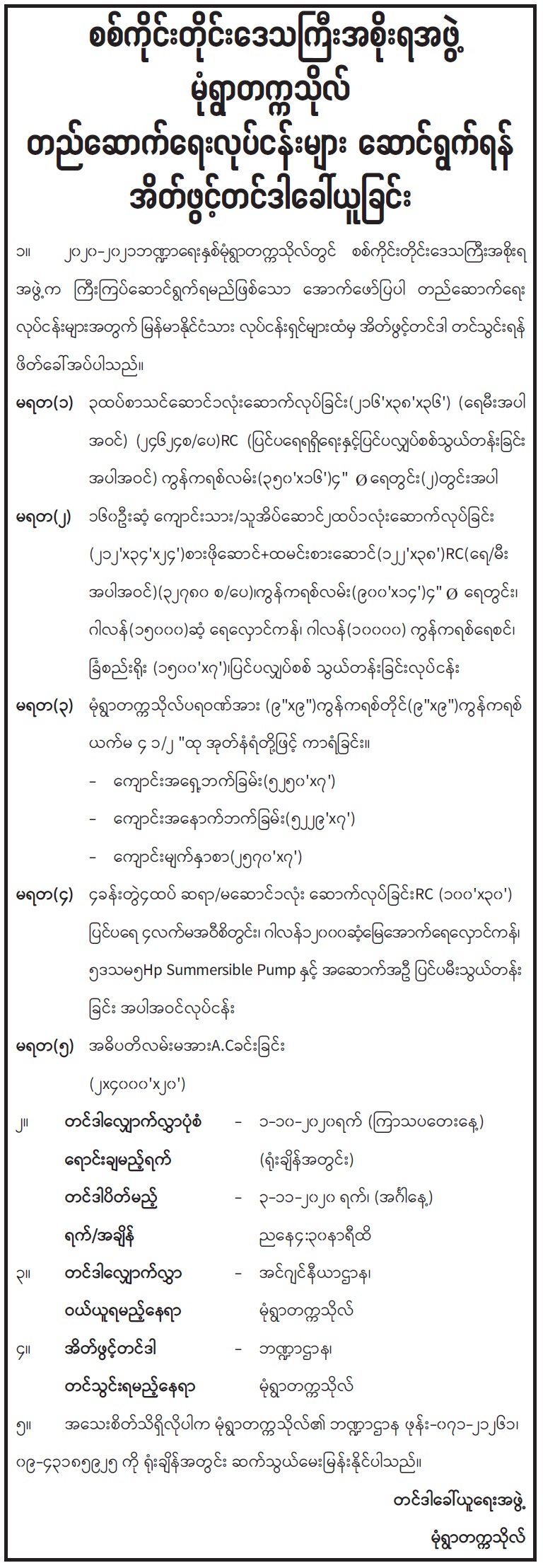 စစ်ကိုင်းတိုင်းဒေသကြီးအစိုးရအဖွဲ့ မုံရွာမြို့ တည်ဆောက်ရေးလုပ်ငန်းများဆောင်ရွက်ရန် အိတ်ဖွင့်တင်ဒါခေါ်ယူခြင်း Type: တင်ဒါကြေညာချက်များ
