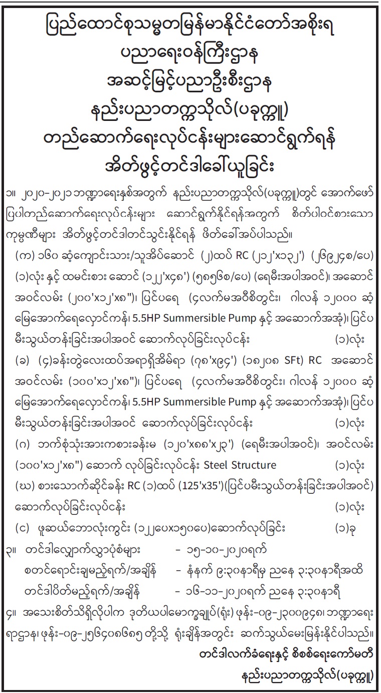 နည်းပညာတက္ကသိုလ်(ပခုက္ကူ) တည်ဆောက်ရေးလုပ်ငန်းများဆောင်ရွက်ရန် အိတ်ဖွင့်တင်ဒါခေါ်ယူခြင်း Type: တင်ဒါကြေညာချက်များ