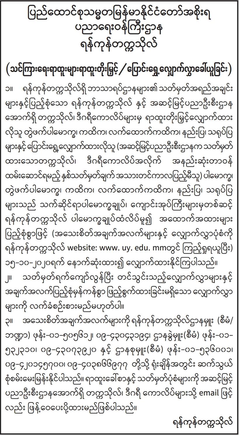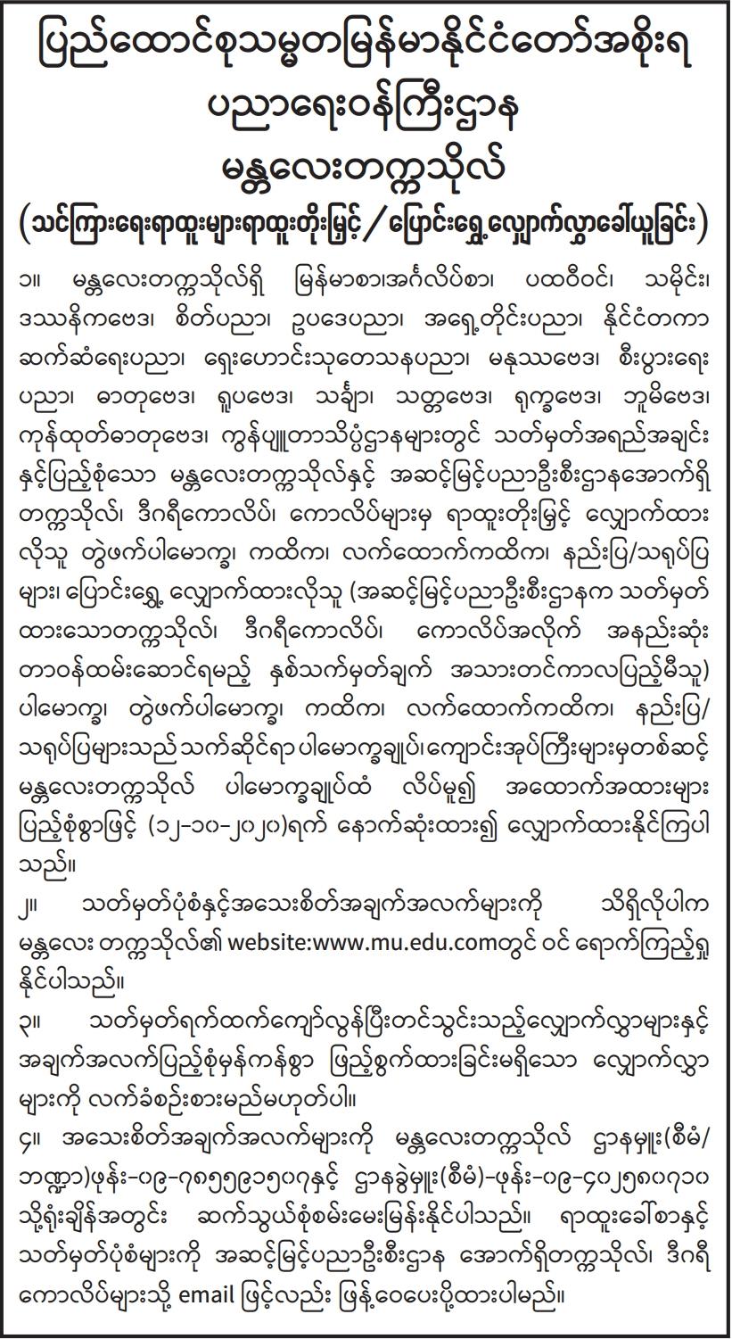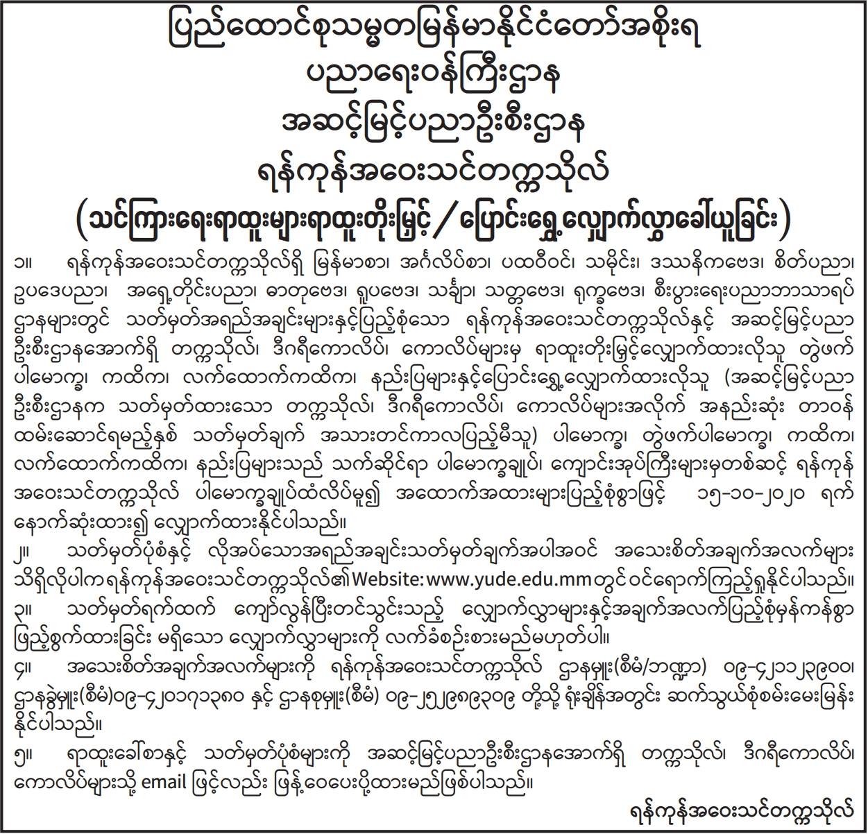 အစိုးရနည်းပညာအထက်တန်းကျောင်း(ကလေး)နှင့် အစိုးရနည်းပညာအထက်တန်းကျောင်း(တမူး)တို့အတွက် တည်ဆောက်ရေးလုပ်ငန်းများဆောင်ရွက်ရန် အိတ်ဖွင့်တင်ဒါခေါ်ယူခြင်း Type: တင်ဒါကြေညာချက်များ