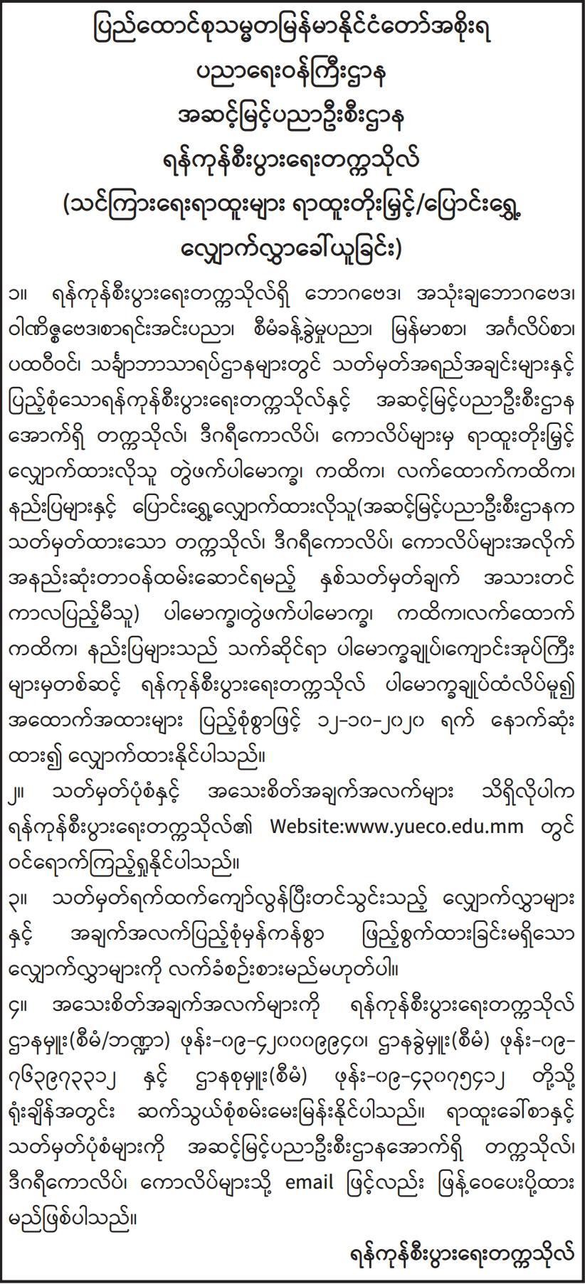 ရန်ကုန်စီးပွားရေးတက္ကသိုလ် (သင်ကြားရေးရာထူးများ ရာထူးတိုးမြှင့်/ ပြောင်းရွှေ့ လျှောက်လွှာ ခေါ်ယူခြင်း)