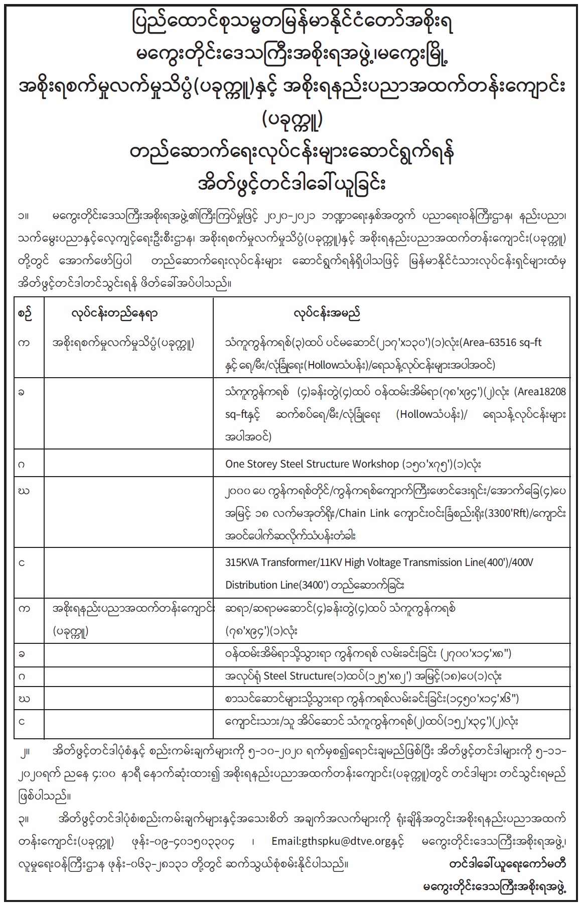 အစိုးရစက်မှုလက်မှုသိပ္ပံ(ပခုက္ကူ)နှင့် အစိုးရနည်းပညာအထက်တန်းကျောင်း(ပခုက္ကူ) တည်ဆောက်ရေးလုပ်ငန်းများဆောင်ရွက်ရန် အိတ်ဖွင့်တင်ဒါခေါ်ယူခြင်း Type: တင်ဒါကြေညာချက်များ