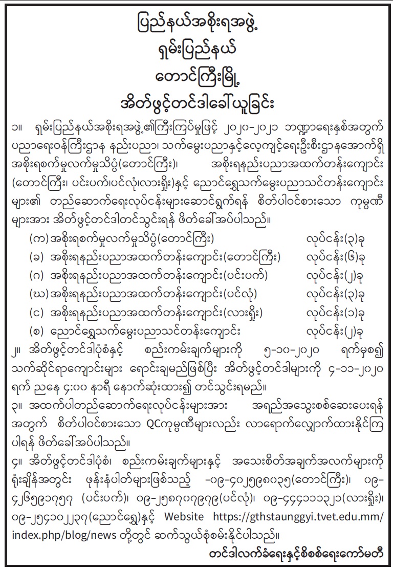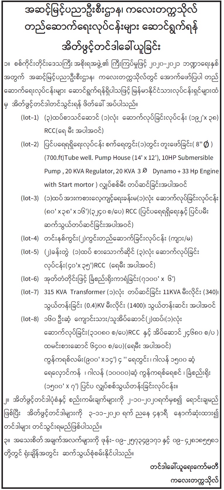 အစိုးရစက်မှုလက်မှုသိပ္ပံ(ရေနံချောင်း) တည်ဆောက်ရေးလုပ်ငန်းများဆောင်ရွက်ရန် အိတ်ဖွင့်တင်ဒါခေါ်ယူခြင်း Type: တင်ဒါကြေညာချက်များ