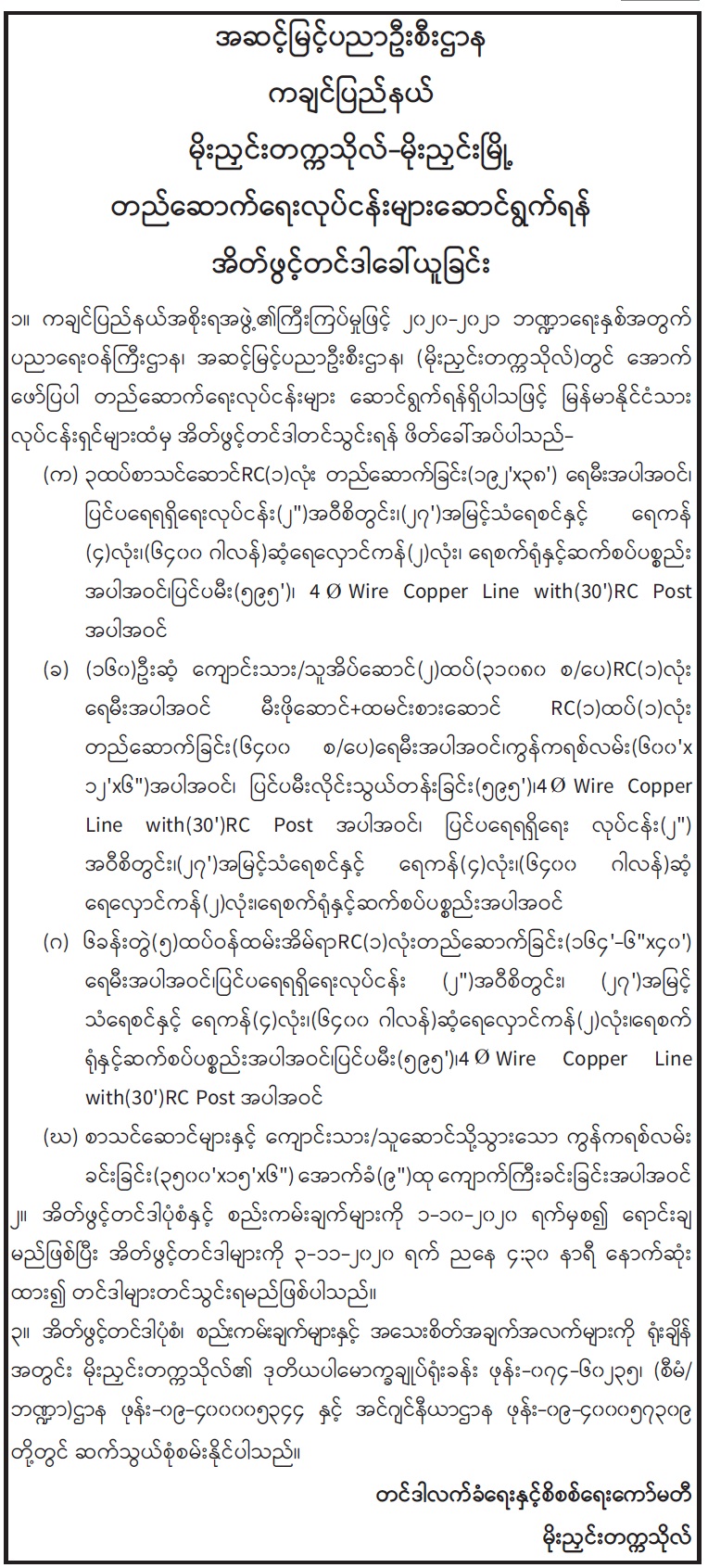 မိုးညှင်းတက္ကသိုလ် တည်ဆောက်ရေးလုပ်ငန်းများဆောင်ရွက်ရန် အိတ်ဖွင့်တင်ဒါခေါ်ယူခြင်း Type: တင်ဒါကြေညာချက်များ