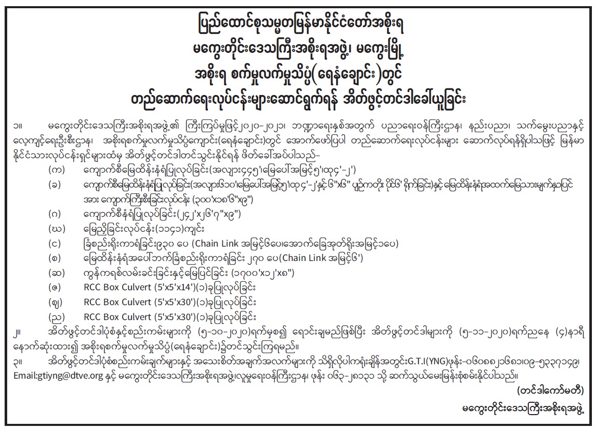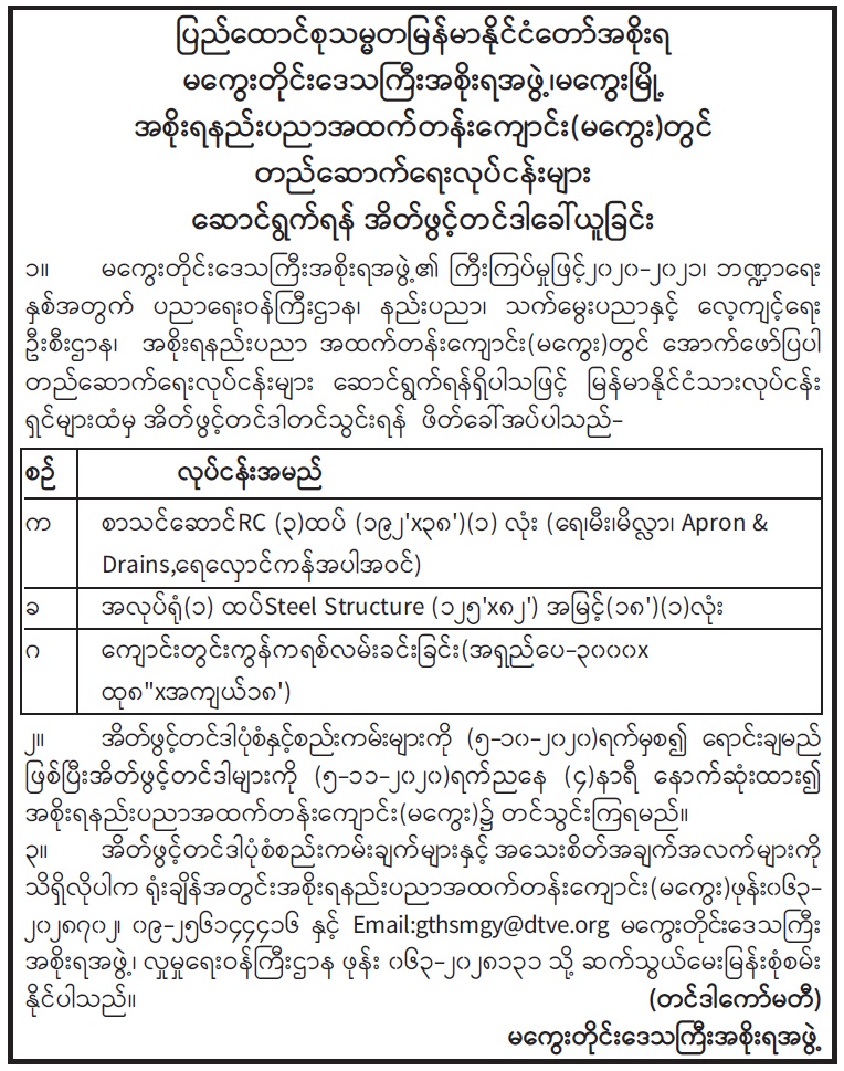 အစိုးရနည်းပညာအထက်တန်းကျောင်း(မကွေး) တည်ဆောက်ရေးလုပ်ငန်းများဆောင်ရွက်ရန် အိတ်ဖွင့်တင်ဒါခေါ်ယူခြင်း Type: တင်ဒါကြေညာချက်များ