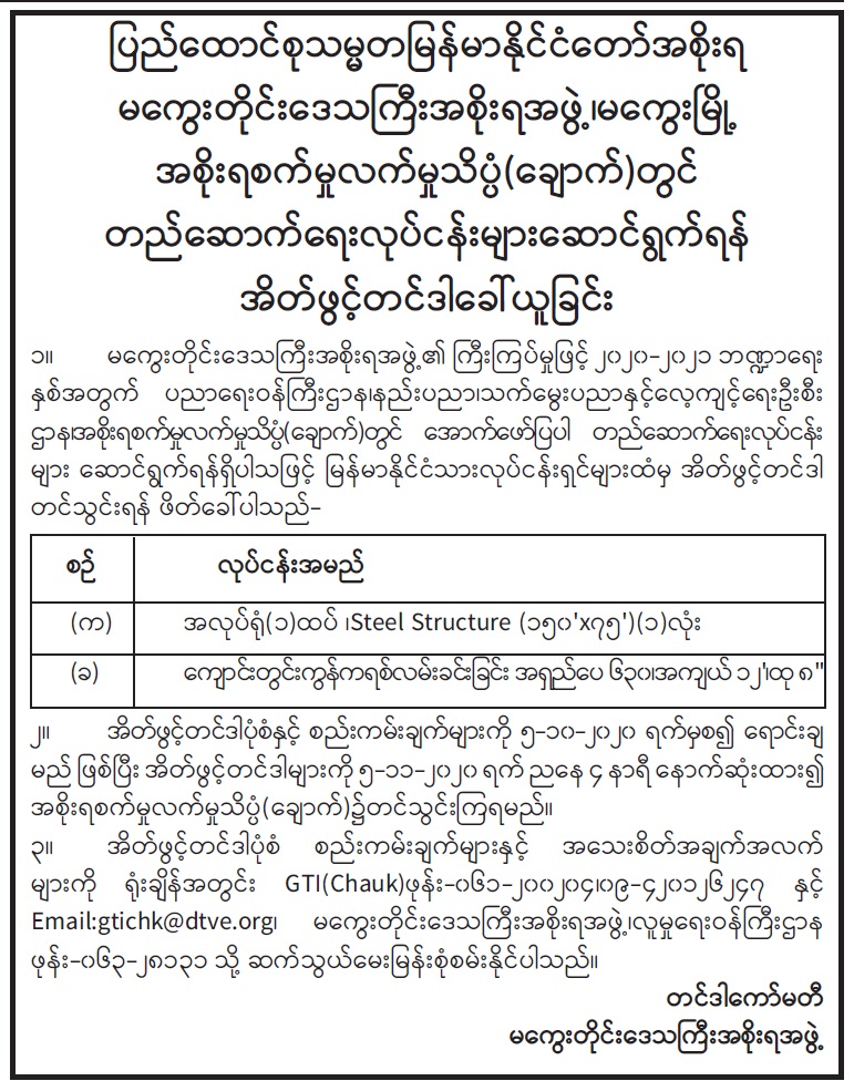 အစိုးရစက်မှုလက်မှုသိပ္ပံ(ချောက်) တည်ဆောက်ရေးလုပ်ငန်းများဆောင်ရွက်ရန် အိတ်ဖွင့်တင်ဒါခေါ်ယူခြင်း Type: တင်ဒါကြေညာချက်များ