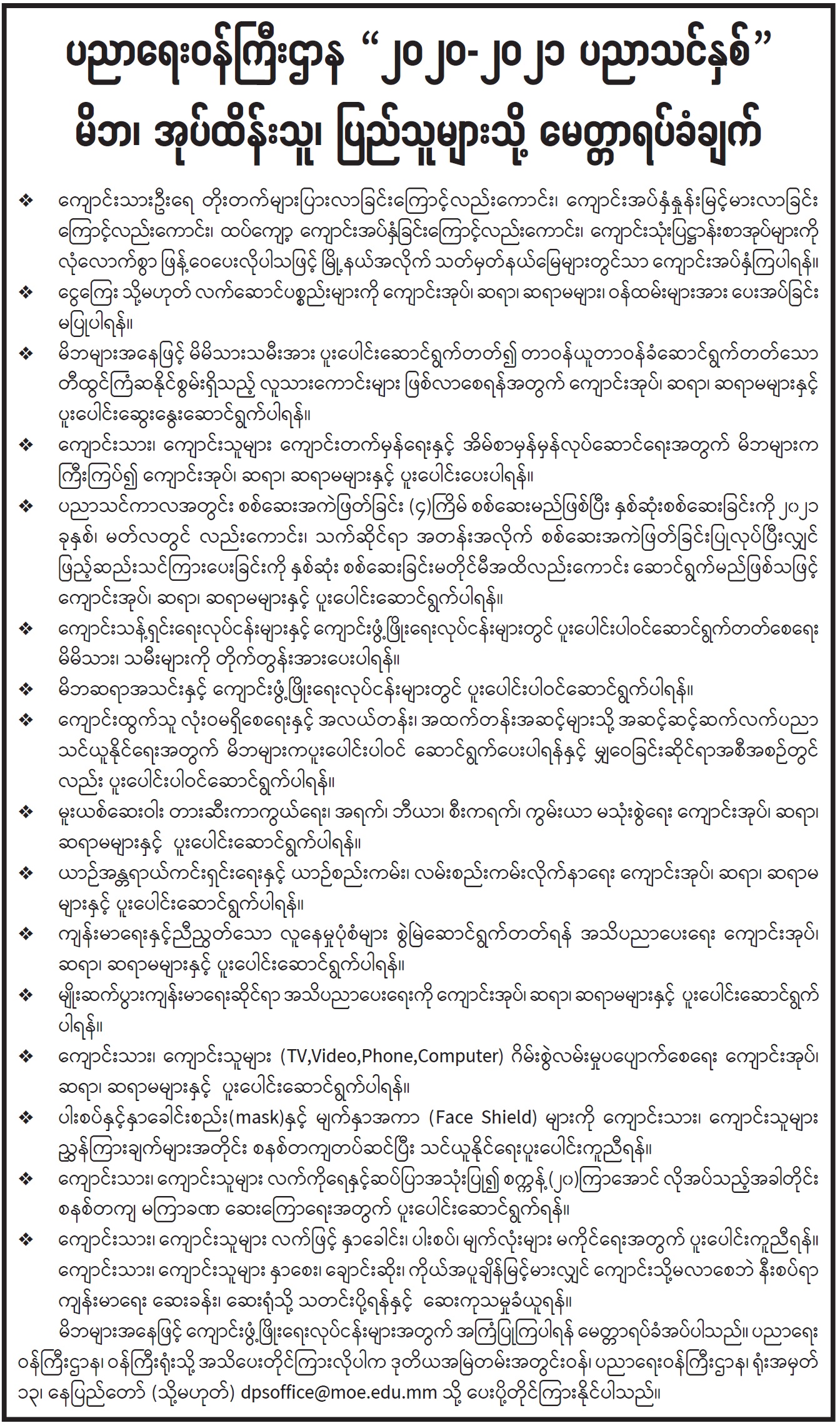 ၂၀၂၀-၂၀၂၁ ပညာသင်နှစ် မိဘ၊ အုပ်ထိန်းသူ၊ ပြည်သူများသို့ မေတ္တာရပ်ခံချက်