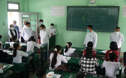 ပညာရေးဝန်ကြီးဌာန ပြည်ထောင်စုဝန်ကြီး ဒေါက်တာညွန့်ဖေ၊ ကျန်းမာရေးဝန်ကြီးဌာန ပြည်ထောင်စုဝန်ကြီး ဒေါက်တာသက်ခိုင်ဝင်းနှင့် နေပြည်တော်ကောင်စီဥက္ကဋ္ဌ ဒေါက်တာ မောင်မောင်နိုင်တို့သည် ပညာရေးဝန်ကြီးဌာန ဒုတိယဝန်ကြီး ဦးဇော်ဝင်း၊ တာဝန်ရှိသူများနှင့်အတူ ယနေ့ နံနက် ၉ နာရီတွင် နေပြည်တော် ဇမ္ဗူသီရိမြို့နယ် အမှတ်(၅)အခြေခံပညာ အထက်တန်းကျောင်း၊ ဒက္ခိဏသီရိမြို့နယ် အမှတ်(၁၈)အခြေခံပညာ အထက်တန်းကျောင်းများသို့ သွားရောက်၍ ဆရာ ဆရာမများနှင့် ကျောင်းသား ကျောင်းသူများ အေးချမ်းပျော်ရွှင်စွာ ပညာသင်ကြား၊ သင်ယူနေမှုများနှင့် အသက်ငါးနှစ်မှ (၁၂)နှစ်အထိ ကျောင်းသား ကျောင်းသူများ ကျောင်းအခြေပြု ကိုဗစ်-၁၉ ကာကွယ်ဆေး ထိုးနှံပေးနေမှုများကို သွားရောက်ကြည့်ရှု အားပေးကြပြီး လိုအပ်သည်များကို ဖြည့်ဆည်း ဆောင်ရွက်ပေးသည်။